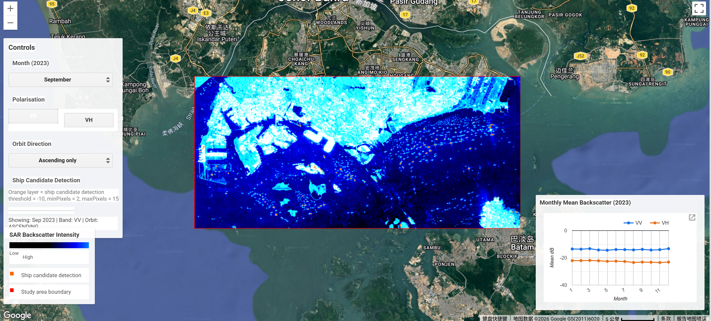 - Monthly mean backscatter chart: A time series chart in the bottom-right corner shows mean VV and VH backscatter values across all 12 months of 2023, enabling users to identify temporal patterns in maritime activity.